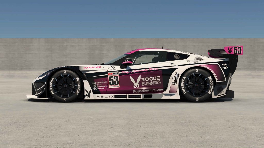 The PCR Team will compete with a Corvette C7 GT3, aiming to fight for podium positions. Adding to the excitement, original Playboy Playmate Victoria Fuller and her Rogue Bunnies (https://roguebunnies.com/) will be providing good vibes and mental support during the race. The car livery, designed by our driver and vehicle designer PCR_RennOpa, is dedicated to them.